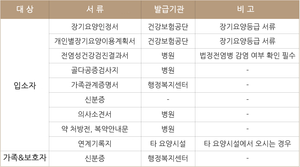 - 입소를 위한 필요한 서류는 아래와 같습니다.